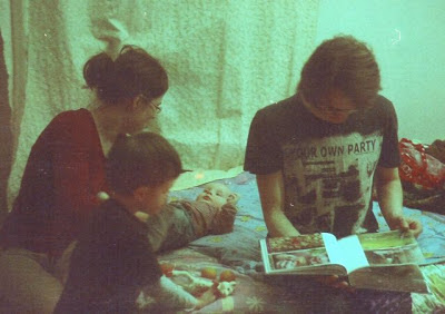 Today we went to Kaur's birthdayparty (by car, altho it's maybe 20 minutes walk from here, but it was too cold for the little men). Kaur is now one year old. Awesome! Here on the photo he's just a month or so old, and with his Papa Leno, who by the way is the best cook ever (think i sat the whole evening behind a plate with rice and beans and salad and lamb and chicken... ) and also a cool painter. Kaurs mom recently translated a book of verse into estonian by Humberto Ak'abal. Such beautiful and capable people. Ak'abals poems were our christmaspoems this holiday and i think we turned some heads.